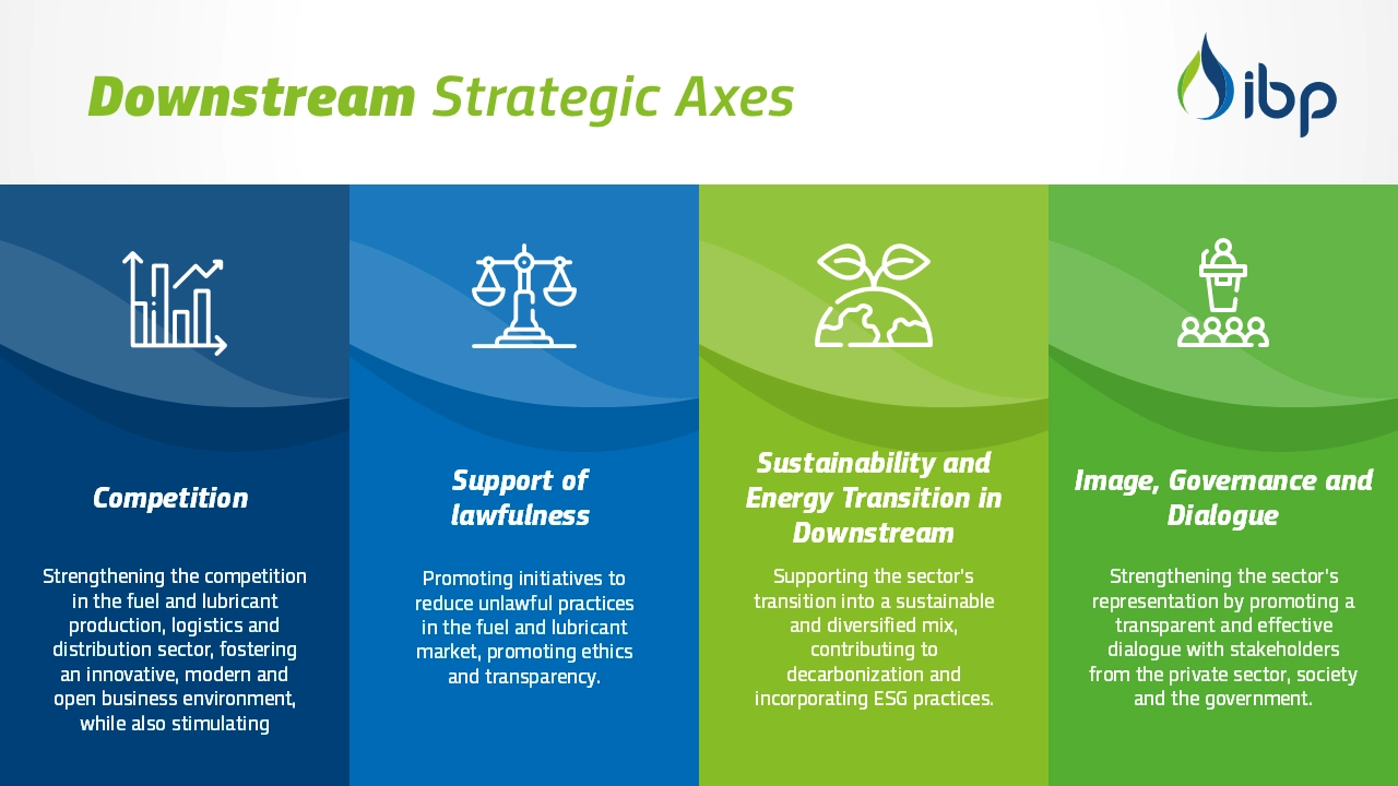 IBP's activities in the Downstream sector contribute directly to Brazil's economic and social development, providing benefits such as job and income generation, the supply of quality products at potentially more competitive prices, reduced fraud and greater consumer confidence, a push for energy transition with a lower carbon footprint, strengthening dialogue with society and public institutions, and the dissemination of good governance, sustainability, and ethical practices, among others.