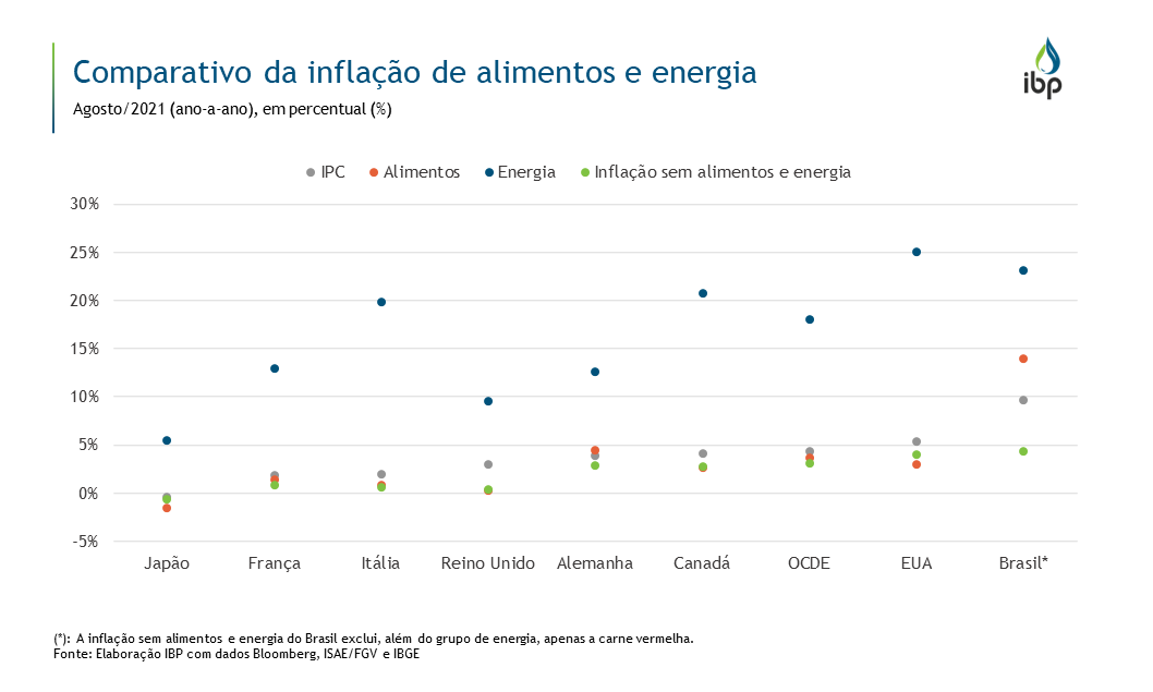 Como a energia é um elemento básico das cadeias produtivas, desencadeia um impacto relevante no nível geral de preços da economia. A alta nos preços de energia é um fenômeno global que atinge, inclusive, economias sólidas, como o Japão. Mesmo com a inflação próxima a zero, observou crescimento de 5% nos preços dos energéticos entre agosto de 2021 e agosto de 2021. Países como os Estados Unidos, Canadá e Itália também foram impactados pela alta de preços, com uma inflação de energéticos superando 20%.