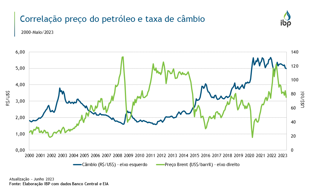 A volatilidade dos preços do petróleo no mercado internacional é um importante determinante da taxa de câmbio. Muitos estudos apontam relação inversa bastante forte entre o preço do petróleo e a cotação do dólar no mercado internacional, o que demonstra uma importância do mercado de capitais sobre o de commodities. Como consequência dessa dinâmica, a taxa de câmbio doméstica, em geral, caminha no sentido contrário dos preços internacionais do Brent.