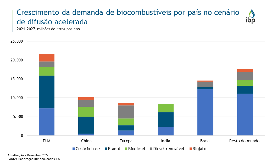 Segundo a Agência Internacional de Energia (IEA), a demanda global total de biocombustíveis deve crescer 22% no período 2022-2027, atingindo 240.000 milhões de litros por ano no caso acelerado, 25% acima do cenário base. Os Estados Unidos, Canadá, Brasil, Indonésia e Índia são responsáveis por 80% da expansão global esperada no uso de biocombustíveis. Destaca-se que todos os cinco países possuem políticas abrangentes para apoiar o crescimento da demanda de biocombustíveis.