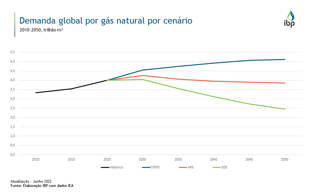 Para as próximas décadas, a Agência Internacional de Energia (IEA, na sigla em inglês) estimou a demanda global por cenário, que dependerá essencialmente das políticas governamentais adotadas, mudanças comportamentais da sociedade e evolução das fontes renováveis na matriz energética. No cenário Stated Policies (STEPS), o crescimento é de 28% até 2050, tendo como principal driver o setor industrial em economias emergentes e em desenvolvimento, em especial a China.