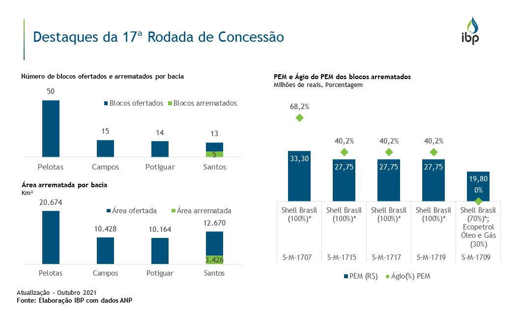 Dentre os 92 blocos ofertados em 4 diferentes bacias na 17ª Rodada de Concessão, apenas 5 foram arrematados, divididos entre 2 setores da Bacia de Santos, e somam 6% da área total ofertada. Os 5 blocos arrematados tiveram a Shell como operadora, sendo consorciada única em 4 deles. Na maioria dos blocos arrematados, houve ágio de mais de 40% sobre o Programa Exploratório Mínimo (PEM).