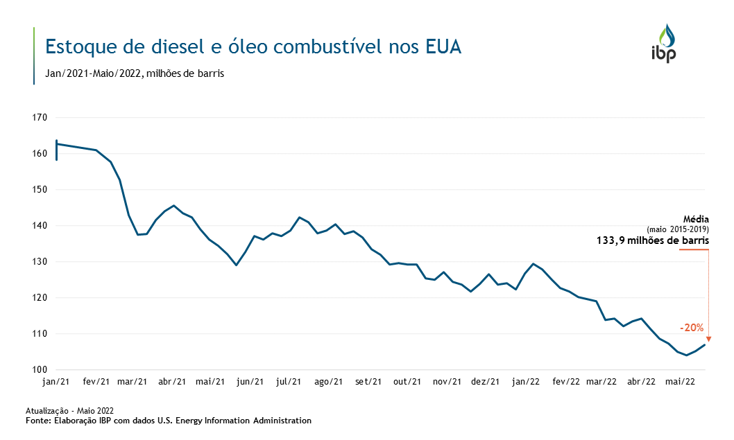Nos EUA, os estoques de destilados caíram 35% desde o início de 2021 e atualmente se encontram cerca de 20% abaixo da média de 5 anos pré-pandemia para o mês de maio.