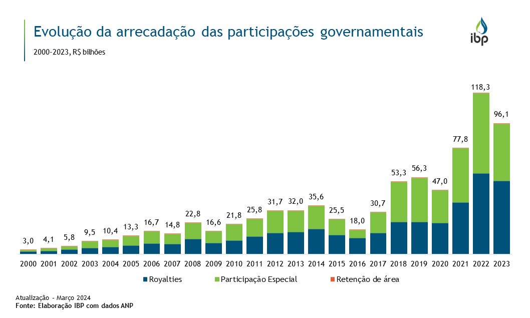 As participações governamentais – royalties, participações especiais e taxa de retenção de área – dependem do volume produzido de petróleo, preço do barril de petróleo, dentre outros fatores. A trajetória crescente da produção brasileira, sobretudo desde 2018, tem contribuído para elevar o patamar de arrecadação. Em 2022, as participações governamentais atingiram um recorde de R$118 bilhões, impulsionadas pela alta dos preços do petróleo após o início da guerra entre Rússia e Ucrânia e as consequentes sanções impostas por países ocidentais à Rússia, levando o petróleo a atingir máximas de US$ 130/barril.