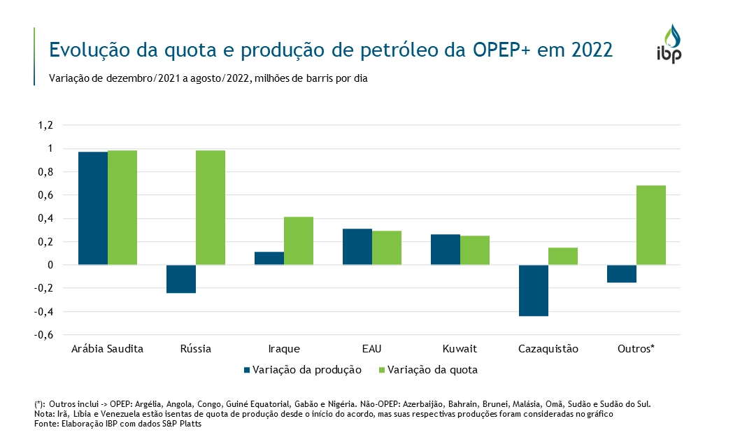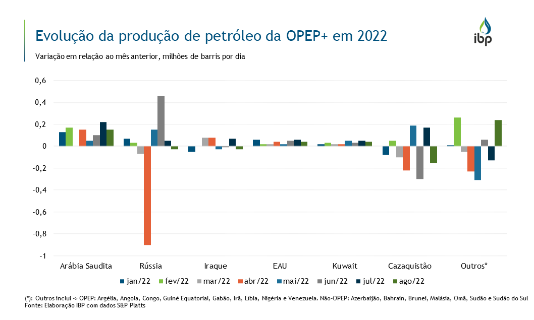 Em agosto de 2022, a Rússia observou uma queda em sua produção de cerca de 240 mil b/d a menos que o patamar de dezembro de 2021. Contudo, nota-se que a produção total da OPEP+ em agosto foi cerca de 820 mil b/d maior ante dezembro do ano passado.