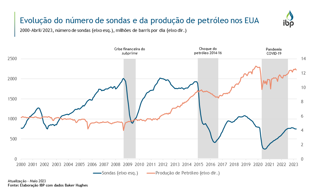 Em três momentos distintos – crise do subprime de 2008, choque do petróleo em 2014-2016 e a pandemia da COVID-19 – o número de sondas, nos EUA, observou uma queda acentuada. Além das variações do nível de preços do petróleo, que influenciam a quantidade de sondas em atividade, os aperfeiçoamentos na perfuração horizontal e o fracking propiciaram ganhos de eficiência, elevando a produção norte-americana mesmo com um patamar menor de sondas.