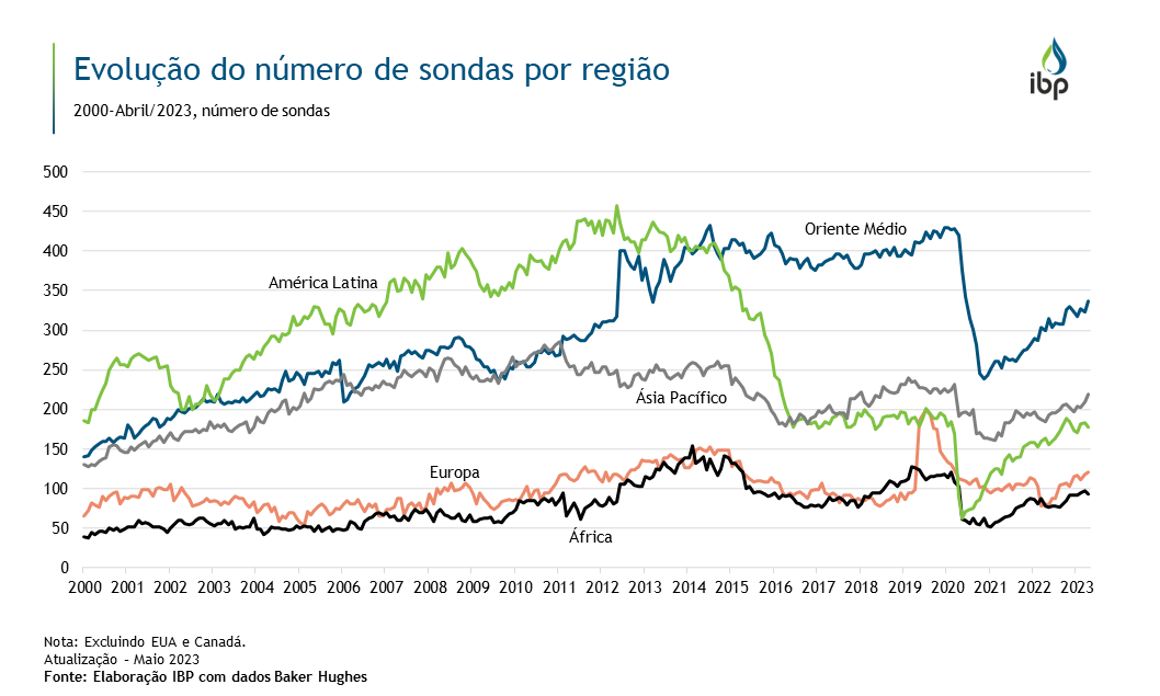 A América Latina apresentou uma intensa atividade de exploração no começo da década, muito explicada pelo potencial de produção local e dos preços internacionais favoráveis. Entre 2012 e 2016, a atividade exploratória caiu de forma expressiva na região. Parte dessa queda pode ser explicada pela não realização de rodadas de licitação no Brasil. Em 2020, com a pandemia da Covid-19 e a queda do preço do petróleo, o número total de sondas em uso no planeta caiu pela metade, atingindo 1.019 sondas em setembro de 2020 – o patamar mais baixo da série histórica iniciada em 1975. Com a retomada da atividade econômica global e da demanda por petróleo, a quantidade de sondas veio crescendo ao longo do ano e chegou a 1.563 em dezembro de 2021.