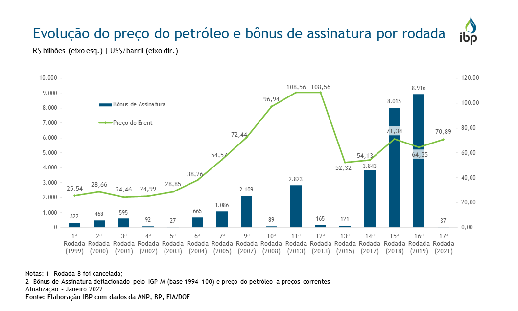 Evolução do preço do petróleo e bônus de assinatura por rodada de concessão