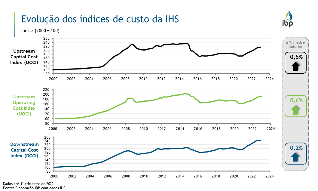 O índice UCCI acompanha as variações de custos dos equipamentos, instalações, materiais e gastos com pessoal utilizados num portfólio diversificado de 28 projetos onshore, offshore, de dutos e de GNL. O UOCI mede as variações nos custos de operação em campos de O&G. Enquanto que o DCCI é equivalente ao UCCI, porém acompanha um portfólio de 40 projetos de refino e petroquímica.
