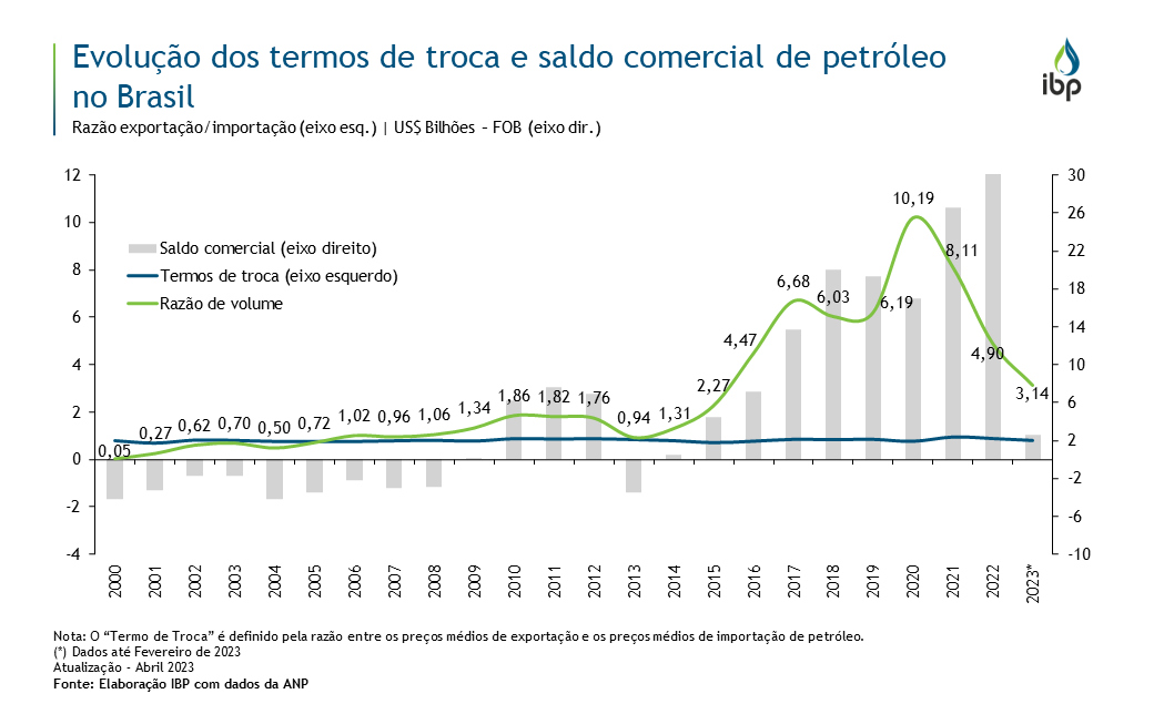 No Brasil, entre 2000 e 2022, os termos de troca de petróleo foram, em média, 0,80 , ou seja, o valor do petróleo brasileiro exportado foi, em média, 20% mais barato que o importado. A partir de 2006, o volume de exportações nacionais de petróleo superou as importações, entretanto apenas em 2010 as receitas de exportação superaram os dispêndios. A partir de 2015, o saldo comercial brasileiro se expandiu, registrando uma queda mais expressiva apenas em 2020, com a pandemia do Covid-19. Apesar disso, em 2021, o saldo cresce novamente em cerca de 39%.
