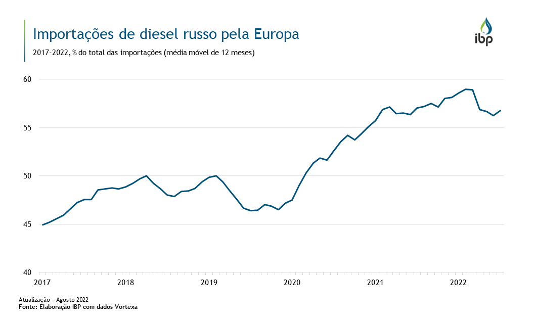 É possível observar a crescente dependência da Europa em relação à Rússia para o abastecimento de diesel, reforçando as dificuldades para a imposição de sanções ao setor energético russo pela União Europeia. O percentual de importações europeias de diesel provenientes da Rússia saltou de quase 45% em 2017 para 59% em 2022.
