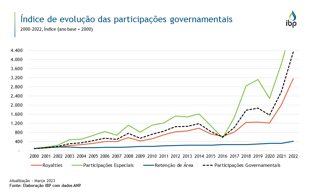 A arrecadação com participações governamentais segue tendência crescente até 2014. Crescimento reforçado pelo aumento da parcela de participações especiais em campos de grande produtividade. Em 2015, no entanto, com a queda dos preços internacionais do petróleo, a arrecadação cai rapidamente. Com a reversão dos preços internacionais, a arrecadação voltou a crescer a partir de 2017, atingindo o ponto mais alto em 2022 diante do aumento da produção de petróleo e dos crescentes preços internacionais.