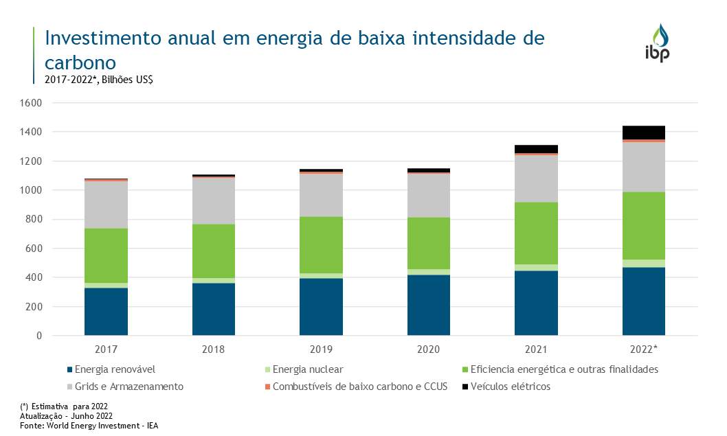 Nos últimos anos, os investimentos globais em energia de baixa intensidade de carbono aumentaram. Para 2022, há uma estimativa de que o investimento em veículos elétricos cresça em 69% em relação ao investido em 2021, enquanto os combustíveis de baixo carbono e CCUS sofrerão um aumento de 19%.