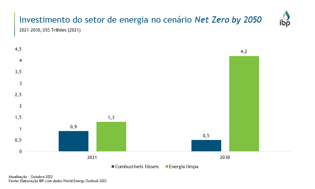 De acordo com a Agência Internacional de Energia (IEA, na sigla em inglês), um grande aumento no investimento em energia é essencial para reduzir os riscos de futuros picos de preços e volatilidade, além de seguir o caminho para emissões líquidas zero até 2050. Dessa maneira, o investimento em energia limpa deve ser superior a US$4 trilhões até 2030 no cenário Net Zero by 2050, destacando a necessidade de atrair novos investidores para o setor de energia.