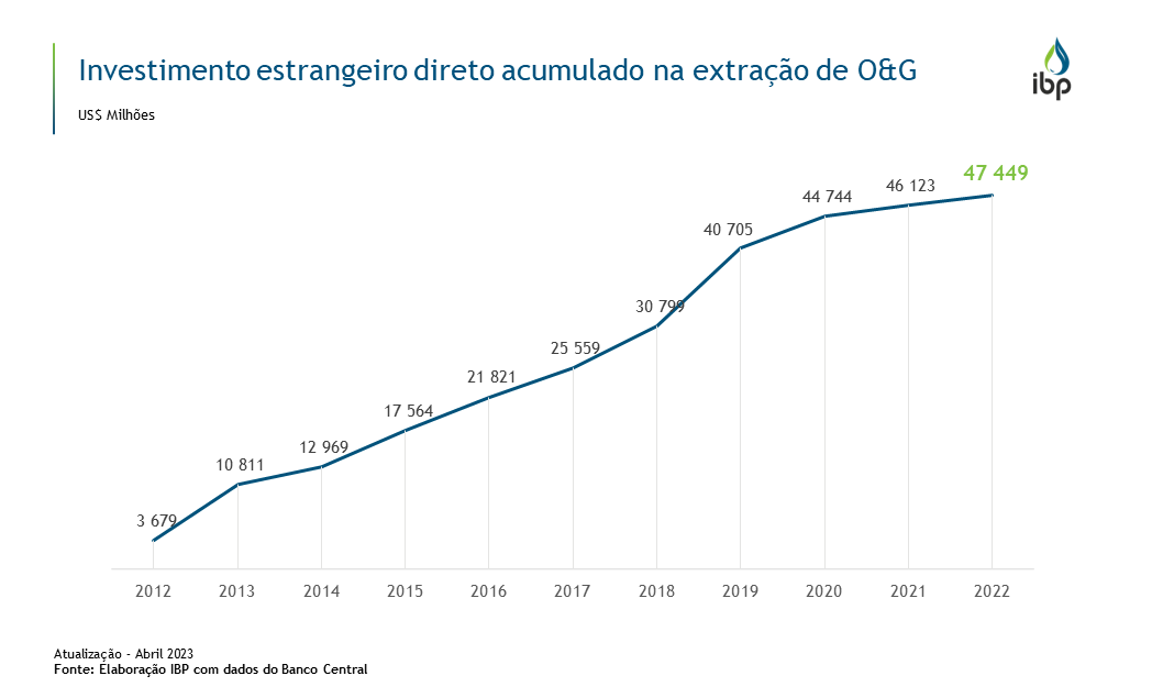 Nos últimos dez anos, a atividade de extração de O&G é uma das principais responsáveis pelo ingresso de investimento estrangeiro direto no Brasil, atraindo mais de US$ 47 bilhões no acumulado. Isto representa aproximadamente 3% do total de IED no período, o que expõe a capacidade do setor de atrair grandes volumes de investimentos.