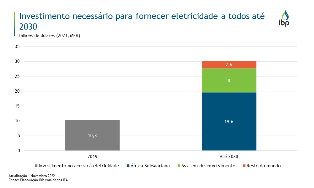 Destaca-se que a crise energética global apresenta oportunidades no contexto de transição energética, mas um dos focos devem ser a questão da segurança energética de modo a fornecer acesso universal à eletricidade. Nesse sentido, a IEA estima que os investimentos devem aumentar cerca de 200% até 2030 em relação a 2019 a fim de garantir o fornecimento de eletricidade a todos.
