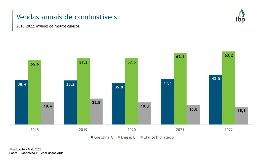 Em relação aos patamares de 2019, as vendas de gasolina encerraram o ano de 2022 com crescimento de 12,8%, enquanto as vendas de diesel subiram 10,3%, ambos atingindo seus recordes históricos.