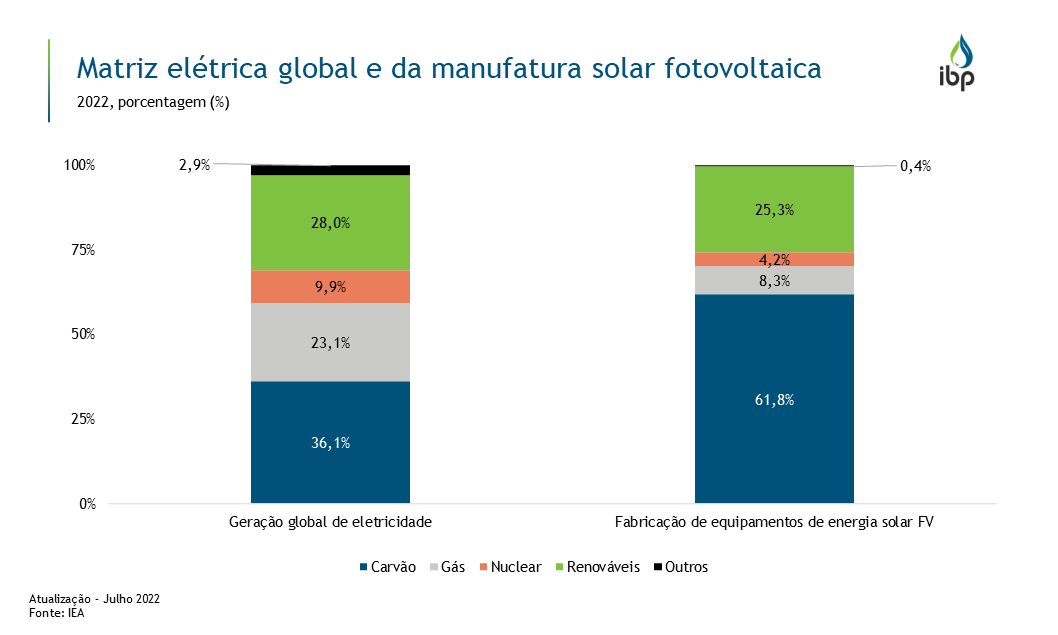 Atualmente, o carvão responde por 36% da matriz elétrica global, porém ao observar a eletricidade utilizada para manufatura solar fotovoltaica, que é intensiva em eletricidade, a participação do carvão sobe para cerca de 62%. Isso pode ser explicado pelo fato da produção fotovoltaica estar concentrada na China, especialmente nas províncias de Xinjiang e Jiangsu, onde o carvão responde por mais de 75% do fornecimento anual de energia, além de se beneficiar de tarifas governamentais favoráveis. Entretanto, vale ressaltar que os painéis solares precisam operar entre a 4 a 8 meses para compensar suas emissões de produção.