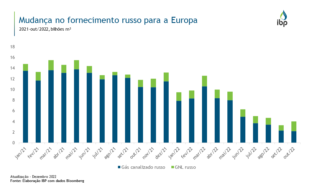 É possível observar que o gás canalizado da Rússia era maior fonte de combustível da Europa antes de iniciar o conflito entre Rússia e Ucrânia. No entanto, com as sanções ocidentais, o fluxo de gás via gasodutos diminuiu e houve uma alteração no fornecimento russo, com a Europa importando mais gás natural liquefeito (GNL) russo. De janeiro a outubro de 2021, a Europa importou um total de 12,6 bilhões de m³ da Rússia. No mesmo período em 2022, o total de importações de GNL saltou para 15,1 bilhões de m³.