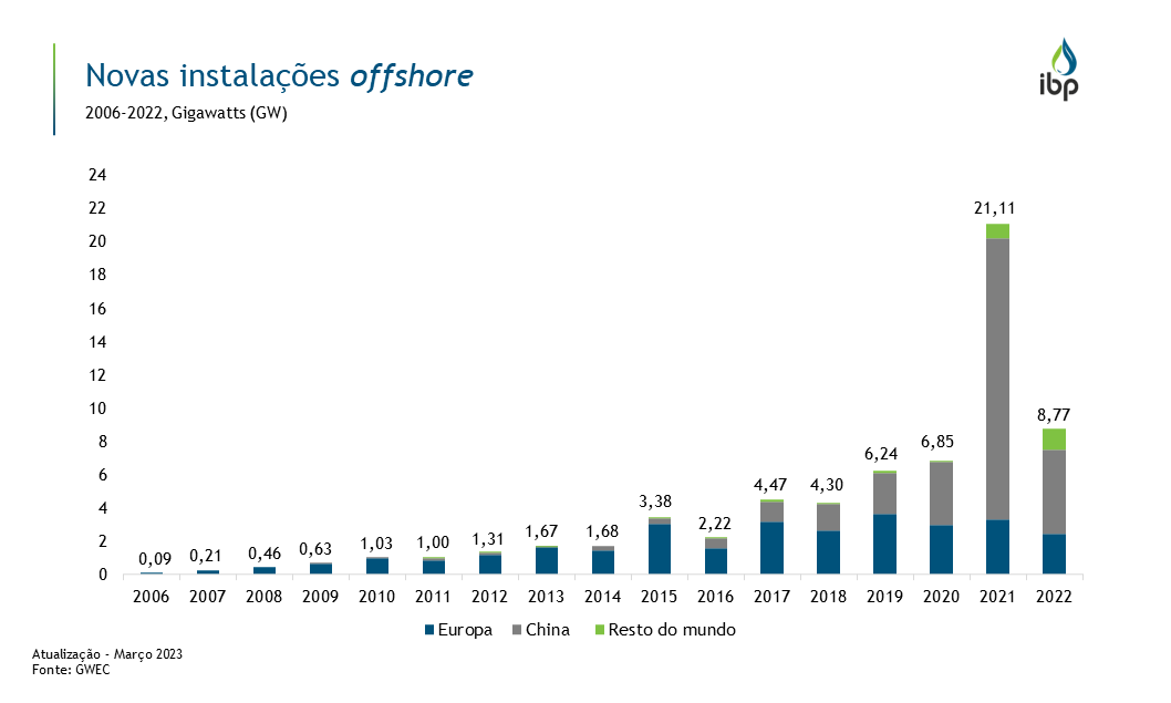 A energia eólica offshore vem ganhando destaque, sendo uma alternativa importante para impulsionar a descarbonização. Em 2021, foram acrescentados à rede 21,1 GW de nova capacidade eólica offshore em todo o mundo, o maior patamar dos últimos anos. Contudo, nota-se uma queda significativa em 2022, de cerca de 58% em comparação a 2021. Apesar da forte redução, 2022 foi o segundo melhor ano da série histórica. Vale ressaltar a continuidade da liderança da China no desenvolvimento da energia eólica offshore, embora as novas instalações em 2022 tenham sido 70% menores do que em 2021.