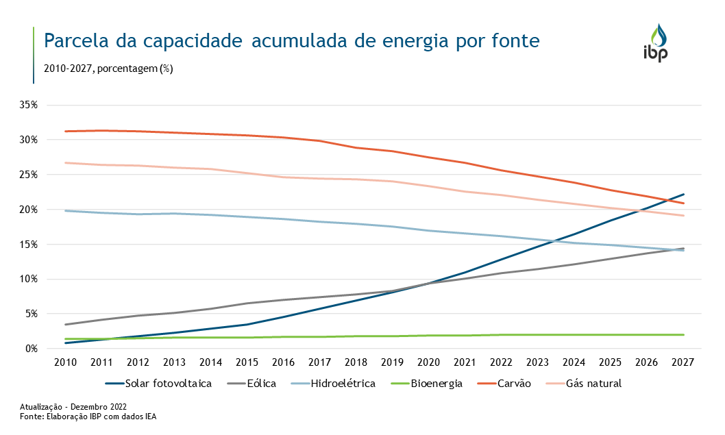 De acordo com a Agência Internacional de Energia (IEA), as energias renováveis transformarão o mix global de energia até 2027, tornando-se a maior fonte de eletricidade. A IEA estima que a capacidade solar fotovoltaica global deve quase triplicar no período 2022-2027, com crescimento de cerca de 1.500 gigawatts (GW) durante o período, superando o gás natural em 2026 e o carvão em 2027. Além disso, a IEA prevê que a capacidade eólica global deve quase dobrar no período de previsão, com projetos offshore respondendo por um quinto do crescimento