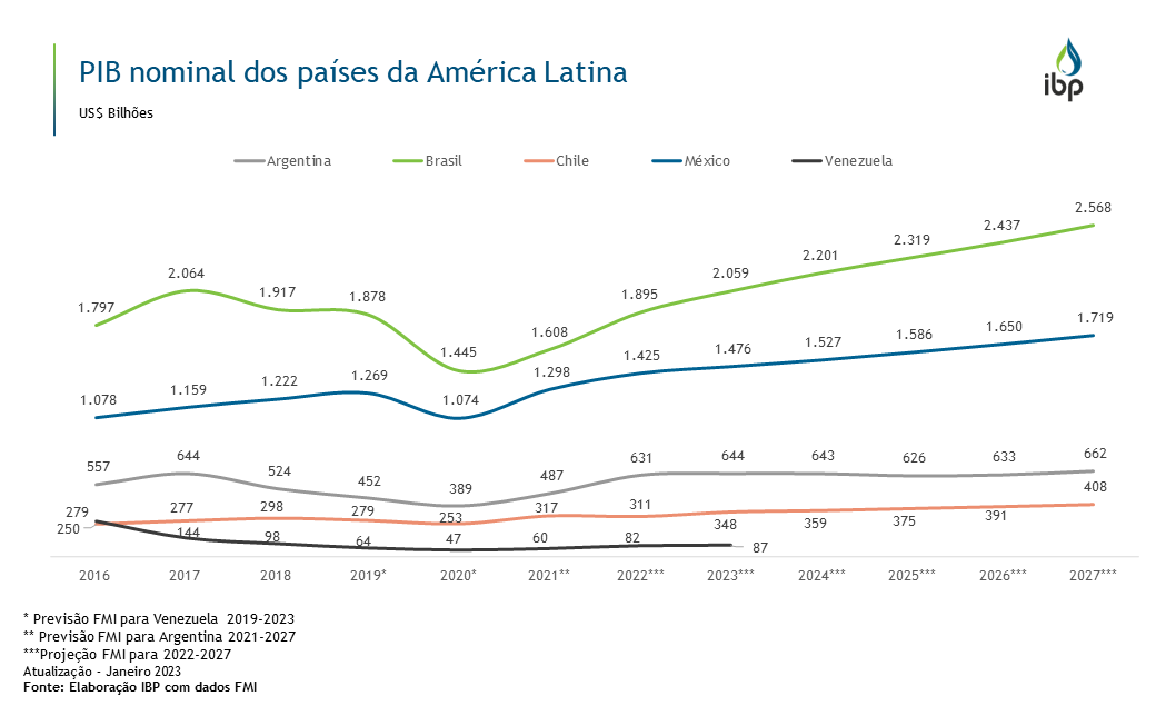 O Brasil é a maior economia da América Latina. O seu PIB se destaca entre os principais produtores de petróleo da região, porém, nos últimos anos, vem caindo em termos nominais, o que pode ser atribuído em parte a forte desvalorização do Real frente ao Dólar.