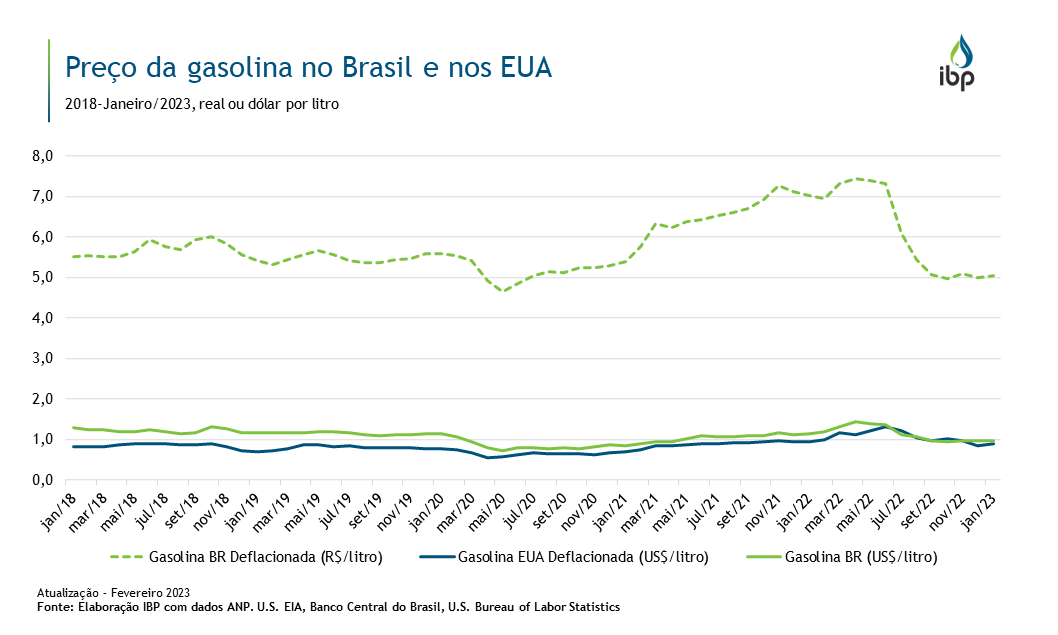 Entre 2018 e início de 2020, a gasolina brasileira – em valores deflacionados – flutuou entre R$ 5 e 6/litro. A partir de 2021, com a reabertura das economias, que puxou os preços internacionais do petróleo para cima, além da depreciação cambial observada no país, o preço da gasolina atingiu o pico de R$ 7,4/litro em abril de 2022.