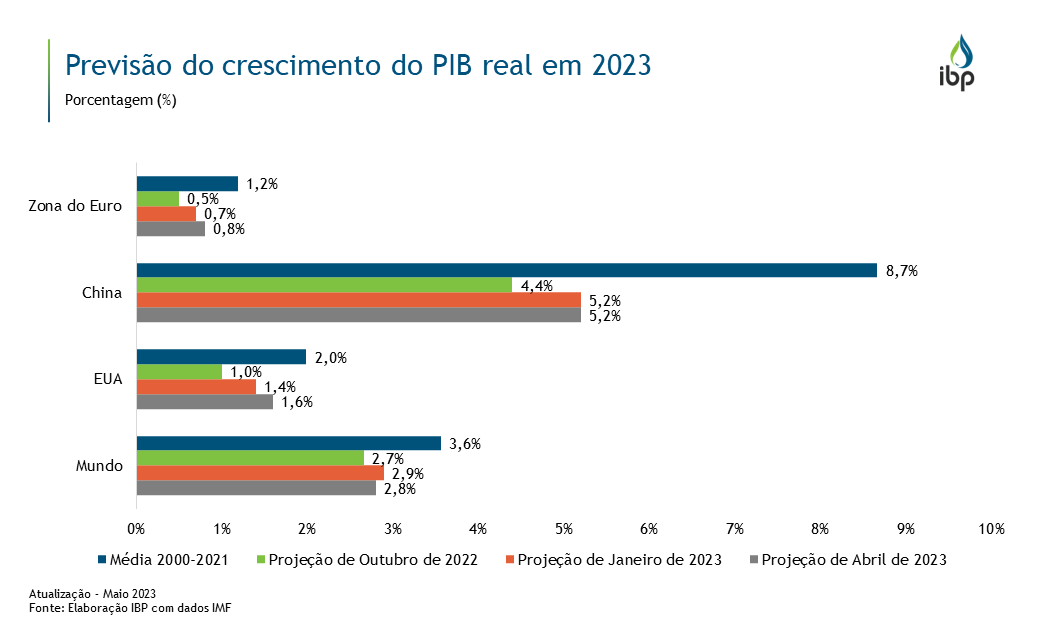 De acordo com o Fundo Monetário Internacional (FMI), a turbulência do setor financeiro, a alta inflação e os efeitos contínuos do conflito entre Rússia e Ucrânia estão impulsionado a incerteza no cenário econômico. Assim, em seu relatório de abril de 2023, o FMI espera que o crescimento global reduza de 3,4% em 2022 para 2,8% em 2023.