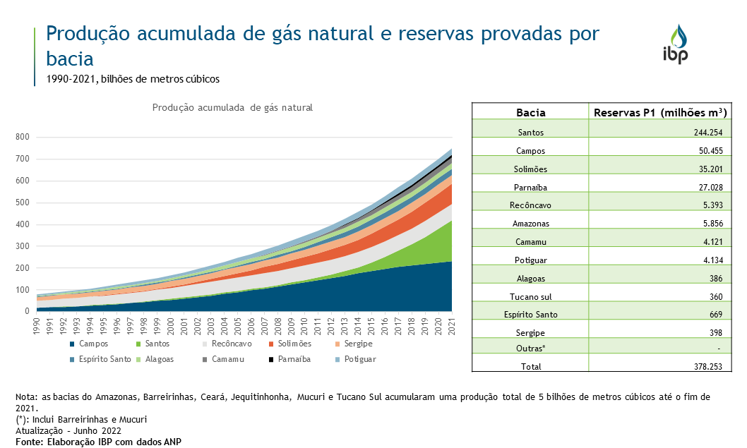 Desde 1960, o Brasil produziu, ao todo, cerca de 757 bilhões m³ de gás natural. A Bacia de Campos foi a que mais contribuiu para esse volume, sendo responsável por quase 1/3. Por outro lado, o recente crescimento da produção de gás associado na Bacia de Santos tem contribuído com parcela expressiva do total nacional – 68% em 2021, valor 126 vezes superior ao observado em 2008. Em relação às reservas provadas, Santos também detém a maior parcela – 64% do país. Vale ainda destacar os volumes contidos em Solimões e Parnaíba, apresentando um potencial de crescimento e atração de novos investimentos.