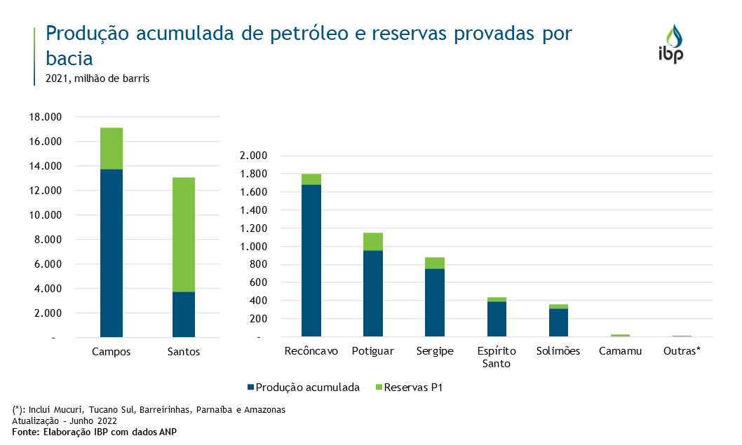O Brasil encerrou o ano de 2021 com reservas provadas de petróleo equivalentes a 13,2 bilhões de barris, tendo produzido 21,8 bilhões de barris em toda a sua história. 63% dessa produção foi realizada na Bacia de Campos, que, somada à de Santos, detém 96% das reservas provadas brasileiras. Espera-se que as concessões recentes de blocos, em especial as do polígono do pré-sal, elevem o nível de reservas do país nos próximos anos. Não obstante, é importante que se avance no aumento do fator de recuperação dos campos maduros, gerando maiores investimentos, reservas e retornos para sociedade na forma de participações governamentais, emprego e renda.