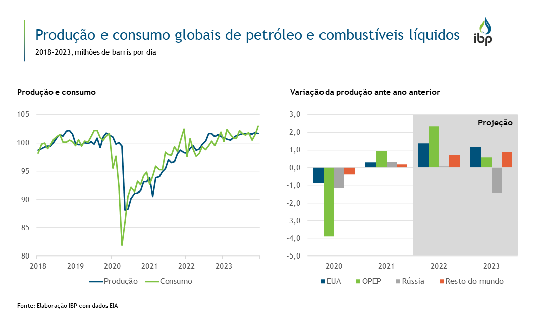 Desde o início da reabertura das economias globais e relaxamento das medidas de distanciamento social, o consumo global de petróleo e combustíveis líquidos superou a produção na maioria dos meses, pressionando os preços internacionais do petróleo para cima. A U.S. Energy Information Administration (EIA, na sigla em inglês) estima que essa situação se inverterá já em 2022.