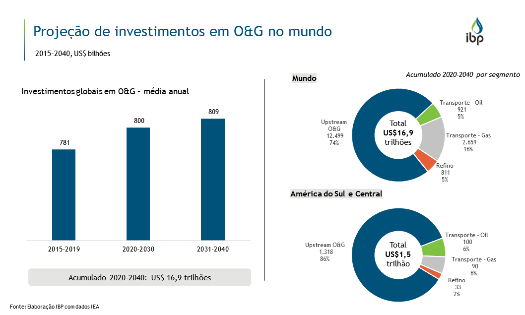 No seu cenário Stated Policies, da tradicional publicação World Energy Outlook 2020, a Agência Internacional de Energia estima que os investimentos em O&G terão ligeiro aumento, em comparação com o período de 2015 a 2019, e se manterão relativamente estáveis nas próximas duas décadas ao redor do mundo. Cerca de ¾ desse montante serão destinados ao upstream. Na América do Sul e Central, o upstream responde por parcela ainda maior, impulsionado pelo pré-sal brasileiro e o offshore da Guiana.