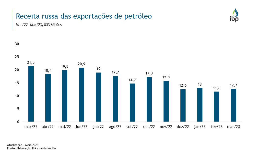 Com a queda nas exportações e nos preços do petróleo em comparação com os patamares do 1º semestre de 2022, a receita de exportação de petróleo da Rússia encolheu para US$12,6 bilhões em dezembro, o menor patamar de 2022, de acordo com a Agência Internacional de Energia (IEA, na sigla em inglês). Somado a isso, descontos recordes para preço de referência russo Urais fizeram com que as receitas da Rússia caíssem. Em março de 2023, a receita russa de exportações de petróleo se recuperou para US$12,7 bilhões, porém, este valor foi cerca de 43% menor do que o mesmo período em 2022.