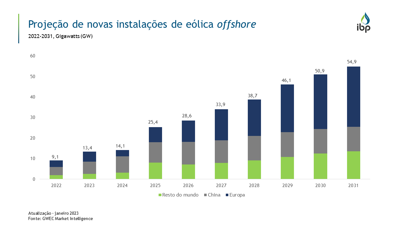A projeção do Global Wind Energy Council (GWEC) indica um expressivo crescimento para as eólicas offshore nos próximos anos, com grande destaque para o continente europeu. Desta forma, essa fonte tende a desempenhar papel-chave no contexto da transição energética. Neste cenário, países como o Brasil que possuem grande potencial para o desenvolvimento das eólicas offshore têm condições de assumir posição estratégica neste mercado, sobretudo se houver o aproveitamento das sinergias existentes entre setores como o de petróleo e gás natural.